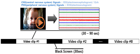 The MERTI-Apps dataset collected the records of multimodal recordings of participants in their responses to fifteen emotional videos. Initially, the classification system with eight emotions was established based on the arousal and valence domains: happiness, excited, sad, bored, disgust, anger, calm, and comfortable, to build an experimental video set. The videos to be presented to induce emotions were searched randomly and collected on YouTube using the emotional vocabulary keywords. Five to seven research assistants reviewed the collected videos, and videos judged to induce emotions were classified by search keywords. To select videos optimized for emotion induction, the content validity of the emotion inducement suitability (emotion type, intensity, etc.) was then checked through a field test. As a result, the final emotion collection videos were selected except for images with a Content Validity Index (CVI) of 2.5 or lower. The final 32 videos were selected from the four valence–arousal bases (high arousal positive valence: HAPV, high arousal negative valence: HANV, low arousal positive valence: LAPV, low arousal negative valence: LANV) and neutral domains. Among them, 15 were selected for the participant’s concentration time. Each video spanned from 60 to 206 s, an average length of 114.6 s. Sad emotions were difficult to induce quickly compared to other public databases, so the length of sad images was longer than that of other databases. The recruitment process, consent, laboratory environment, emotion-inducing videos, participant treatment, follow-up management, and other measurement items showed a CVI value of 0.92 between experts. Expert CVI measurements secured the validity, and a pilot test was conducted. This video selection process was conducted by a research team at Inha University Department of Social Welfare. Table 4 lists the three experiments. Experiment 1 was performed using EMG and EOG, excluding EEG to analyze the peripheral nervous signals other than EEG. Experiment 2 considered only emotional recognition using the CNS, such as the EEG signal, and measured the EEG, EMG, and EOG signals together to remove the noise caused by movements of the head and facial muscles using EMG and EOG signals. In this case, the problem of the EMG electrode covering the face was identified. In experiment 3, the PPG and GSR signals, which are from the peripheral nervous system, were synchronized with the EEG signal, excluding the EMG signal, and different nerve signals, such as CNS and PNS, were measured in a multimodal form.
