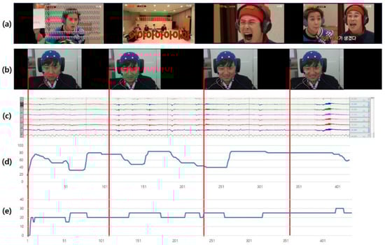 MERTI-Apps data acquisition example, (a) video, (b) face video, (c) bio-signals, (d) valence annotation labeling, (e) arousal annotation labeling.