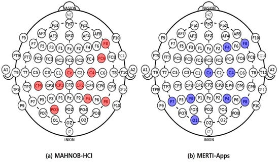 Based on Figure 6, valid channels were searched and expressed, as shown in Figure 11. In Figure 6a, the MAHNOB dataset results indicated that the electrodes of the right brain, parietal lobes, and occipital lobe were helpful for emotion recognition. Similarly, in Figure 6b, the experimental results of MERTI-Apps also confirm that the electrodes at similar positions are valid. In other words, there is no significant difference between the MAHNOB-HCI dataset based on Westerners and the MERTI-Apps dataset based on Asians. In the experiment using the MERT-Apps dataset, the arousal performance was better than the valence performance when human expression was absent. Moreover, additional bio-signals, such as EMG, EOG, and PPG, can compensate for the characteristics not found by EEG signals.