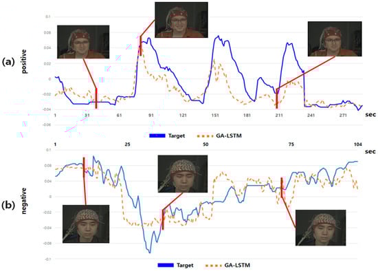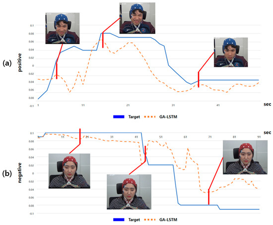 Table 6 summarizes the results of the valence experiments using only the PSD feature in the previous study with the MAHNOB dataset and using all extracted features proposed in this study. “N/A” denotes the not applicable cells. The GA–LSTM model took approximately six times longer to evaluate the ultimate features through the GA than the existing learning model [15]. Using only the PSD feature, the LSTM-FC model shows a 3% performance improvement over the previous study [15]. A root-mean-square error (RMSE) of 0.0156 with the GA-LSTM model yielded a 24% improvement over [15] when the brain lateralization (BL) feature was added. This suggests that the feature selection using the GA and many features is useful for emotion recognition. Figure 8 gives an example of the test result of annotation labeling using the MANHOB-HCI dataset. The solid line indicates the change in target valence over time, and the valence predicted by GA-LSTM is indicated by the dotted line. The thresholds for annotation labeling ranged from −0.1 to 0.1. Figure 8a shows positive valence changes over time, and Figure 8b shows the negative valence changes over time. The target and GA–LSTM results tend to be similar. The peculiar thing is that, after the positive or negative valence expression, the GA–LSTM valence tends to return to the neutral value faster than the target valence. The reason is the imbalance of the annotation data. Because the number of positive annotations is greater than the number of negative annotations, it affects the model more, and negative valence or arousal may not be regressed accurately. Furthermore, positive emotions are almost good for facial expressions, while negative emotions are difficult to label by facial expressions because of the severe individual differences. Hence, the labeling method by facial expression is vulnerable to negative emotional expression.