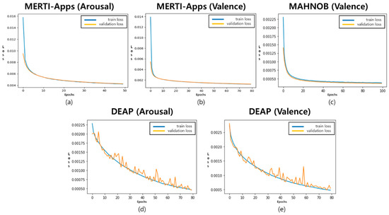 Training loss and validation loss of GA-LSTM Model using (a) MERT-Apps Arousal, (b) MERT-Apps Arousal, (c) MAHNOB, and (d) DEAP Arousal, (e) DEAP Valence datasets.