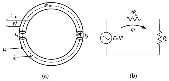 When the two parts of the split-core are joined, a certain air gap remains between them that results in a magnetic reluctance (R) increase, since the gap represents an opposition to the magnetic flux (Φ) normal flow [15,30]. As shown in Figure 4, this effect is analogous to adding a series resistor in an electronic circuit to reduce the magnitude of the current. In Figure 4, Rc represents the reluctance of the core, Rg the reluctance of the gap, Φ the magnetic flux that flows through the magnetic path length of the core (lc), lg the length of the air gap, i the current that flows through the conductor and N the number of turns.