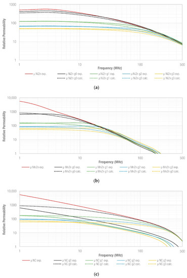 Figure 5 shows the experimental relative permeability measured for each of the three cores included in Table 1, considering the five different cases in terms of the gap introduced. The experimental traces (solid traces) are compared with the effective relative permeability calculated (dotted traces) by using Equation (6), considering the four gaps defined above. This parameter has been calculated from the experimental relative permeability of the non-split-core sample. These data are expressed through a vector formed by 801 frequency points with their corresponding permeability values. The effective relative permeability of a core with a specific gap is determined by computing these values point by point. Thereby, the air gap factor value Fg changes throughout the frequency range analyzed. It is possible to observe that both NiZn and MnZn graphs show a similar response between calculated and experimental results. There is a significant match in the low-frequency region, particularly in the NiZn samples, since they provide a lower and more stable permeability than MnZn cores. In the high-frequency region, the calculated effective relative permeability is lower than the experimentally measured one, verifying that Equation (6) provides an underestimation of this. Another difference between NiZn and MnZn traces is observed by comparing the g0 traces because the initial permeability decreases mostly in MnZn because the original non-split-core yields a higher initial permeability than the NiZn sample. The estimation of g0 traces was obtained by fixing a gap of 0.01 mm between both split parts in order to simulate the real snap ferrite’s behavior, and the estimated values match with the experimental data [13]. The NC graph shows a different behavior than the ceramic core since the experimental and calculated permeability only matches in the low-frequency region. Therefore, unlike ceramic cores, it is not possible to estimate with Equation (6) the effective relative permeability of NC in the middle and high-frequency region when used as a snap ferrite due to its different internal structure.