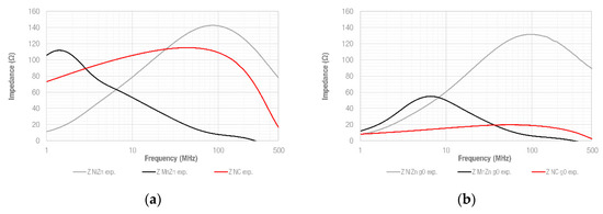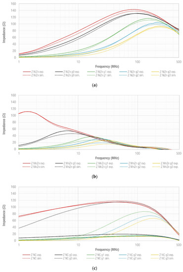 From the results obtained, the red traces of the graphs show the impedance provided by each non-split sample and it is possible to verify that the simulated and experimental results are a good match and, consequently, the data derived from the experimental setup can be considered in the whole frequency range analyzed. Consequently, a parametric gap sweep was performed in the simulation model by setting the four defined gap situations (g0, g1, g2 and g3) and keeping the same magnetic properties introduced to the non-split model. As can be observed, there is an excellent agreement between simulated and experimentally obtained results in NiZn and MnZn traces, whereas there is a significant difference in the NC case. This fact correlates with the conclusions obtained from the effective permeability data of the NC sample, shown in Section 2. Therefore, it is not possible to determine the NC sample’s behavior when it is split and gapped by considering the non-split sample’s magnetic properties. This is because the cut section’s metallization is not able to maintain the high performance of the original NC sample. Then, the NC experimental results are considered to compare its performance with that provided by NiZn and MnZn samples.