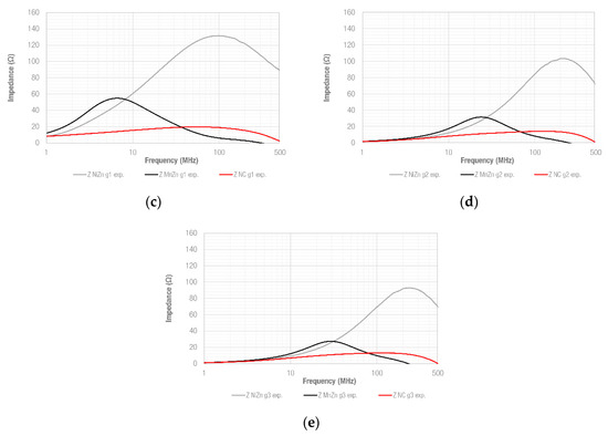 Comparison between the measured impedance of NiZn, MnZn and NC cable ferrites, considering five different gap cases: (a) NiZn, MnZn and NC non-split-cores; (b) NiZn, MnZn and NC g0 split-cores; (c) NiZn, MnZn and NC g1 split-cores; (d) NiZn, MnZn and NC g2 split-cores and (e) NiZn, MnZn and NC g3 split-cores.