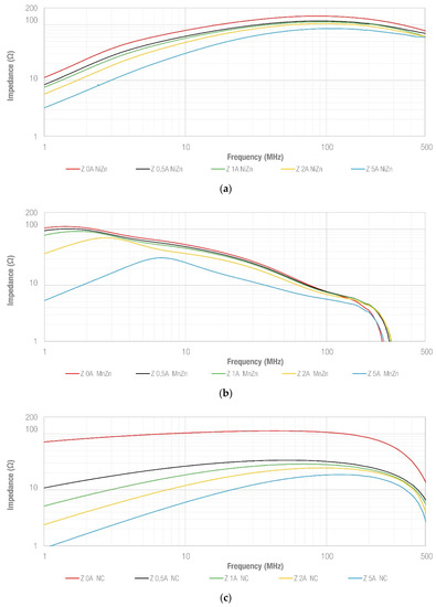 How splitting a cable ferrite into two parts, to be employed as a snap ferrite, modifies the impedance behavior was analyzed. Depending on the core’s magnetic properties and structure, this involves a certain degradation of the EMI suppression ability. Nevertheless, splitting a cable ferrite could result in an advantage if the component is intended to encircle cables where DC currents are flowing. To further investigate this effect of the DC currents on the impedance, Figure 11 shows the impedance response of each of the three different materials studied when they are under DC bias conditions. Each material is represented in a separate graph and the response of the non-split sample is shown when different values of DC currents are injected (0 A, 0.5 A, 1 A, 2 A and 5 A), as described in Section 3. Figure 11a shows that the five traces have a similar trend, but the higher the DC current value, the lower the sample’s impedance. This effect is observed from the lowest DC current value (0.5 A) and does not modify the impedance response significantly when compared to MnZn and NC results (Figure 11b,c, respectively). It is interesting how the resonance frequency is moved to higher frequencies when an increasing DC current is injected into the MnZn sample, specifically in the cases of 2 A and 5 A. As regards NC behavior, it shows a significant impedance decrease in the low-frequency region and its performance is reduced more than that of ceramic cores when a DC bias flows through the cable.
