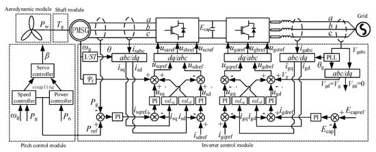 The direct drive wind generator unit is mainly composed of a wind turbine, a drive shaft, a permanent magnet synchronous generator (PMSG), a converter and a control system [,], whose structure is shown in Figure 1. In the two-phase synchronous rotating coordinate system, the mathematical model of PMSG is obtained: