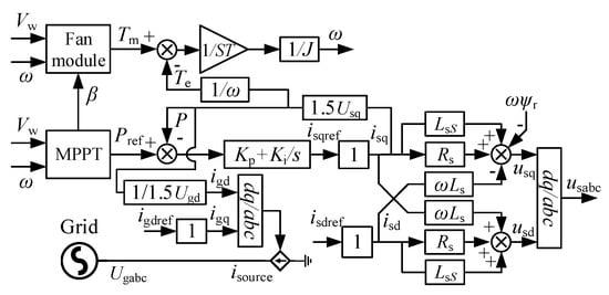 The simplified model of the direct drive wind generator is shown in Figure 2. The fan module calculates the mechanical torque Tm through the wind speed Vw and the rotor speed ω, and then it is brought into the rotor motion equation. The MPPT model calculates the power reference value Pref through the wind speed Vw and the rotor speed ω. After the reference value Pref is compared with the actual value P, the inner loop current reference value isqref is obtained through the PI controller. Since the inner loop is simplified, its output is equal to its input. After the current value isq, isd brought into the stator voltage equations, the stator voltages Usabc are obtained through coordinate transformation. With the active power value P and grid voltage Ugabc, the grid current value igd, igq are calculated. Then, the reference command value of the controlled current source is obtained through coordinate transformation.