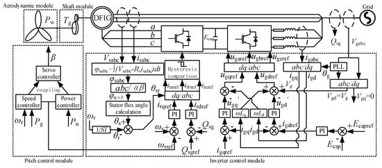 The generator-side converter uses the generator rotor flux vector control method, which is usually isd = 0 control [], to control the electromagnetic torque output by the generator and then control the generator speed to achieve the purpose of maximum power point tracking (MPPT). The grid-side converter inverts DC power into AC power. The converter adopts double closed loop control, the outer loop is the power loop, and the inner loop is the current loop.