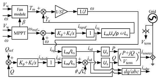 The fan module calculates the mechanical torque Tm through the wind speed Vw and the rotor speed ω, and then it is brought into the rotor motion equation. The MPPT model calculates the rotor speed reference value ωref through the wind speed Vw and the rotor speed ω. After the reference value ωref is compared with the actual value ω, the inner loop current reference value irqref is obtained through the PI controller. Since the inner loop is simplified, its output is equal to its input. After current value irq, ird brought into the stator current equations, the stator currents isabc are obtained through coordinate transformation. After current value irq, ird brought into the power equations, the stator active and reactive power P, Q are obtained through coordinate transformation. With the active and reactive power P, Q, and grid voltage Vterm, and then the reference command value of the controlled current source is obtained.