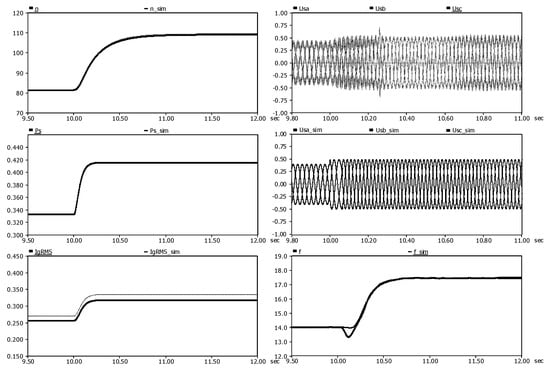In the detailed model, the amplitude of the PMSG stator voltage Usabc gradually increased from 0.40 kV and stabilized to 0.49 kV at t = 11.0 s, the voltage frequency f gradually increased from 14.1 Hz, and stabilized to 17.5 Hz at t = 11.0 s; In the simplified model, the amplitude of the PMSG stator voltage Usabc_sim gradually increased from 0.40 kV (error: 0.0%), and stabilized to 0.49 kV (error: 0.0%) at t = 11.0 s, and the voltage frequency f_sim increased from 14.0 Hz (error: 0.7%) gradually increased, and stabilized to 17.5 Hz at t = 11.0 s (error: 0.0%).