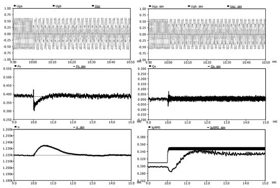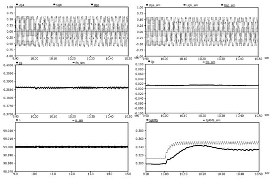 In the detailed model, the average value of the generator output active power Ps was 0.386 MW without significant change; in the simplified model, the average value of the generator output active power Ps_sim was 0.387 MW (error: 0.3%) without significant change.