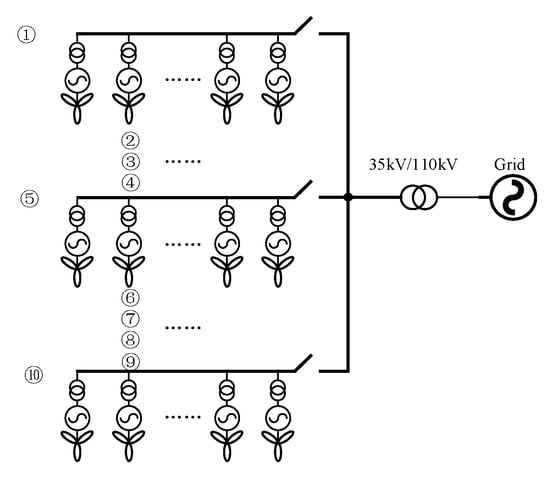 In order to verify the effectiveness of application of single simplified model to large-scale multi-unit wind farm study, a large-scale multi-unit wind farm was built on the PSCAD software platform. The total installed capacity is 100 units and the total capacity is 50 MW, including 50 direct drive and 50 doubly-fed units. In order to reduce the line loss, every single wind generator is connected to the collector line after being boosted by a 0.69 kv/35 kv transformer. The 100 wind generators are divided into 10 columns, each with 10 units. The unit spacing is 0.15 km, and the row spacing is 0.5 km. The line resistance is 0.2 Ω/km, and the line inductance is 0.002 H/km. Its overall structure is shown in Figure 9. Forty units in rows 1 to 4 are 5 + 5 direct-drive and doubly-fed hybrid units; 30 units in rows 5 to 7 are direct drive units, and 30 units in rows 8 to 10 are doubly-fed units.