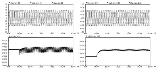 In the simplified model, for 35 kV bus, the amplitude of phase A voltage Ua of the power grid dropped from 28.62 to 19.1 kV, the amplitude of phase B, C voltage Ub, Uc remained 28.62 kV without significant changes. For 0.69 kV bus, the amplitude of phase A voltage Ua of the power grid dropped from 0.585 to 0.392 kV, the amplitude of phase B, C voltage Ub, Uc remained 0.585 kV without significant changes.