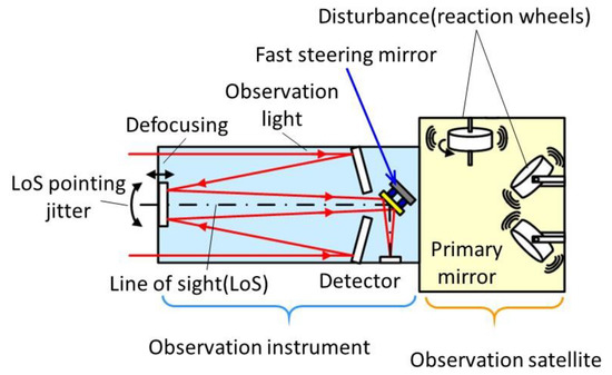 Earth observation and astronomical satellites for acquiring larger-scale, high-resolution images have been developed [1]. The disturbance generated by flywheels for attitude control and other moving components increases the satellite’s vibration and degrades the resolution of the captured images. Figure 1 shows that a fast steering mirror (FSM) [2] positioned in the tip-tilt directions can be used to correct the image blur caused by the vibration of the instrument. The mirror needs to have a large diameter to capture large-scale images. It also has to respond rapidly to compensate for high-frequency vibrations. Rapid response of a large mirror is usually difficult to realize because the larger the mirror is, the more vibration modes the FSM has in the low-frequency range.