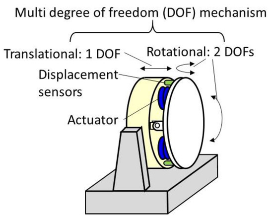 Many FSMs have been developed for corrections of images made by observation satellites and for laser systems for inter-satellite communication. Figure 2 shows a schematic view of an FSM, consisting of a mirror, actuators, displacement sensors, and a guideway mechanism for the tip-tilt motion and axial adjustment of the mirror [3]. Many types of actuator for driving the mirror, such as rotary motors [4], voice coil motors (VCMs) [5], electromagnets [6], and laminated piezoelectric actuators [7], have been tested and used. Electromagnets and laminated piezoelectric actuators generate a large force, but the stroke is smaller than that of a VCM, and non-linearity such as hysteresis and saturation is observed in the input/output characteristics. On the other hand, VCMs can respond rapidly with good linearity and have a larger positioning range than either piezoelectric actuators or electromagnets [5,6,7].