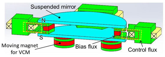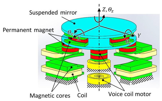 The bias magnetic flux generates magnetic couplings between the U-shaped magnets and the suspended part, as shown in Figure 4. The magnetic couplings generate restoring torques around the X, Y, and Z axes and a restoring force in the axial direction. In the lateral directions, the current through two coils in the U-shaped iron cores facing each other provides push–pull motion needed to stabilize the suspended mirror. The magnetic suspension actively controls the two-DOF lateral movement, and passively supports the mirror for four-DOF out of plane movement.