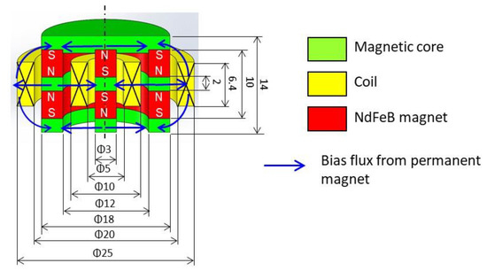 The VCMs have to be compact and generate a sufficient force. Figure 5 shows the dimensions of the designed VCM, which consists of two ring-shaped and two column-shaped magnets, an inner and an outer coil, and magnetic cores. The ring and disk cores are sandwiched between the upper and lower permanent magnets to increase the lateral magnetic flux from the permanent magnets to the coils. The inner and outer coils effectively use the lateral magnetic flux from the permanent magnets to generate an axial Lorentz force. The gap between the coil and the core was set to be large so that there would be no possible contact due to the tip-tilt motion of the mirror.