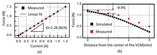 In the simulation, the current–force coefficient of the VCM at the center position was 1.26 N/A, which was verified by measurement, as shown in Figure 6a. As shown in Figure 6b, the reduction in force is about 9.9% for displacement by 1 mm, achieved by applying a current density of 5.4 A/mm2 through the VCM coil. This reduction is acceptable for the positioning controller.