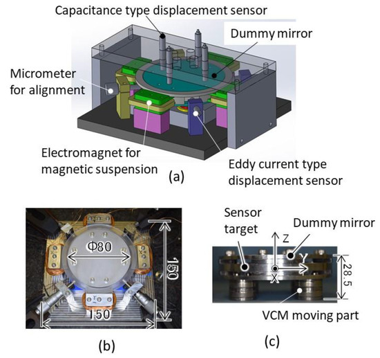 Figure 8b,c show photographs of the assembled FSM without the displacement sensors and the suspended mirror. In order to simplify the fabrication and the experiment, the test mirror was made of duralumin. The diameter and mass of the dummy mirror, including parts of the magnetic suspension and the VCMs, were 80 mm and 0.22 kg, respectively. Compared to actual mirror materials such as quartz glass and beryllium, aluminum alloy for the dummy mirror has a larger specific gravity and smaller Young’s modulus, so the experimental conditions are limiting from the viewpoint of extending the bandwidth. A plastic spacer to limit the lateral movement of the dummy mirror to 0.5 mm was inserted between the mirror and the stator. The touch-up current can be reduced by limiting the air gap, and the controller gains can be set higher. Two micrometers were attached to calibrate the lateral displacement sensors.