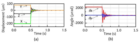 Startup response of the FSM using the magnetic suspension: (a) Translation in the X, Y, and Z directions; (b) inclination in the tip-tilt (θx and θy) directions.
