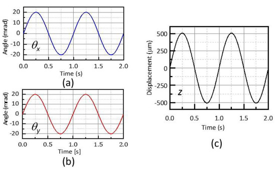 Long stroke positioning of the FSM with the magnetic suspension: (a) Inclination in the θx direction; (b) inclination in the θy; (c) displacement in the Z direction.