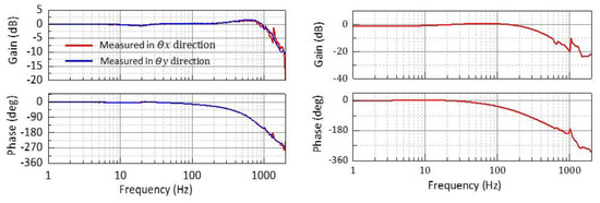 Figure 12a shows the closed-loop frequency responses in the tip-tilt directions. The gain and phase diagrams in both directions are similar, and it is clear that there is no difference between the dynamic characteristics in each tip-tilt direction. The servo bandwidths are 1180 Hz and 1210 Hz in the θx and θy directions, respectively. The design target of 1000 Hz was achieved with simple PID controllers without having to use notch filters to reduce the signals induced by higher vibration modes.