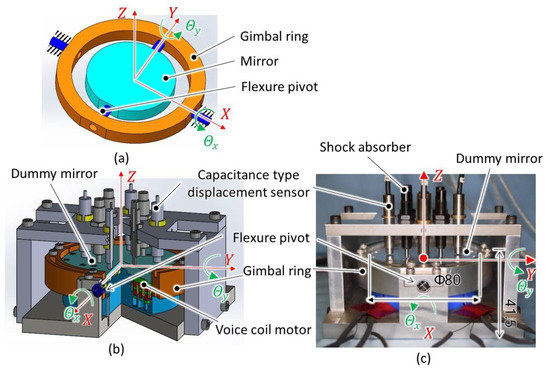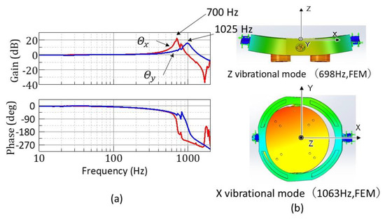 For comparison, an FSM using a gimbal mechanism and flexure pivots (5006-400, Riverhawk Corp., New Hartford, NY, USA) was designed and prototyped, as shown in Figure 13. The mirror size (ϕ80 mm), the design and allocation of the VCMs, the controller algorithm, and the feedback displacement sensors are the same as those used for the magnetic suspension type. The parameters of the PID controller for each axis were adjusted independently to increase the bandwidth by as much as possible. The reference characteristics in the θx and θy directions are shown in Figure 14. The moment of inertia in the θx direction, including the mirror and the gimbal ring, is larger than that in the θy direction. The servo bandwidth in the θx direction could not be made as wide as that in the θy direction. Furthermore, vibration modes other than the tip-tilt motion of the mirror were excited as calculated by FEM and are shown in Figure 14b. These have an effect on the servo bandwidth. By adjusting the control parameters only, the bandwidth for the FSM with the gimbal mechanism could not reach that achieved with the magnetic suspension.