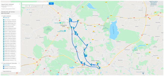 All participants completed their tasks on the same route of 28.7 km in Tarnowskie Góry, Radzionków, Bytom, and Piekary Śląskie in southern Poland presented in Figure 2. The tasks to be completed during the drive were based on the regulations on practical driving tests [28] and included: