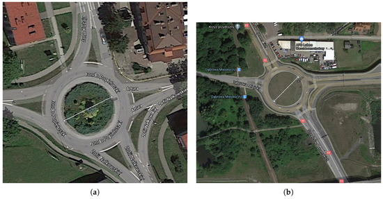 Bird’s eye view of two roundabouts: (a) small roundabout (the diameter of circle island: 20 m); (b) large roundabout (the diameter of circular island: 54 m). Map and satellite images: Google, CNES, Airbus, Maxar Technologies, 2020.