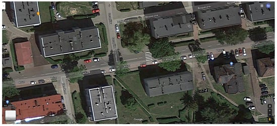 The route included roundabouts and parking lots shown as satellite images in Figure 3 and Figure 4. Figure 3 presents the bird’s eye view of two roundabouts (small and large) and Figure 4 presents the bird’s eye view of public parking spaces with no ticketing along the Artura street in Radzionków (Poland).