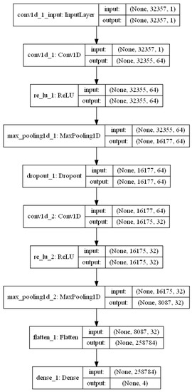 - Convolution with max pooling block—first convolution layer produces 64 feature maps which are then processed by activation function in order to capture non-linear patterns and followed by pooling layer with kernel size of two to reduce the extracted information. The second convolution layer generates 32 feature maps with kernel of size three (as in the first block), followed again by rectified linear unit (ReLU) and pooling layer [35]. Although the kernel size of convolutional layer may be much higher in the case of 1D CNN than in their two-dimensional (2D) counterpart, the best results were achieved with the smaller kernel.