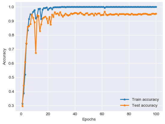 The accuracy curve shows the correctness of the model’s performance among the epochs. Both train and test accuracy achieved high values (above 90%) after circa 40 epochs.