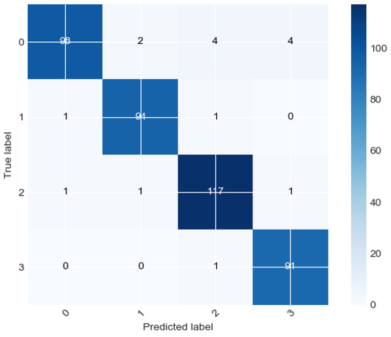 - Dense and flatten blocks—after obtaining the data from the second convolutional pooling block, the feature maps are mapped into their one-dimensional representation and classified with the single and final layer consisting of four neurons followed by softmax probability activation function.