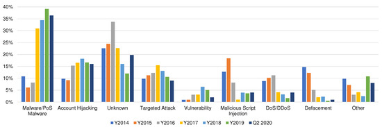 Security attacks are becoming more targeted and less general, with an epidemic escalation in attack complexity [32]. Attackers are currently relying more on unknown attack techniques that resemble normal traffic and are fragmented, encrypted or obfuscated to avoid detection by traditional intrusion detection systems [33]. This is evident from the study of the statistics of the common techniques used in cyber-attacks published in monthly reports [34]. Figure 1 shows the distribution of the attack techniques from 2014 to Q2 2020. When comparing the top attack techniques over the past six years, two conclusions can be drawn: firstly, unknown techniques were the dominant attack vector for the years 2014–2016 and displayed a steady increase in the that period; secondly, unknown techniques witnessed a noticeable decrease in the period from 2017 to 2019. One might argue that this decrease is merely a result of attackers relying on easier attack vectors such as account hijacking, in addition to the rise of cyber-crime as a motivation behind security attacks from 62.3% in 2014 to 85.82% ending Q2 in 2020, which explains the prominent inflation in the number of malware-related attacks in the same period (i.e., 2017–2019). In addition, unknown attacks were the third most common kinds of security attacks in the Middle East and North Africa (MENA) region in March 2019 [35].