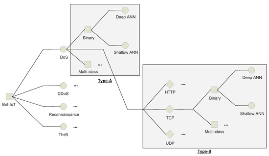 As previously described in Table 2, the UNSW-NB15 dataset has nine attack classes and no subclasses; therefore, only unknown attacks of Type-A were generated. For each of the nine attack classes, four models were built, trained and tested, two of which were shallow and deep binary classification models, and the other two were multi-class classification models, resulting in a total of 36 models. On the other hand, the Bot-IoT has both class and subclass labels; thus, both Type-A and Type-B testing sets were generated. Four Type-A attack classes and 10 Type-B attack subclasses were found; therefore, 16 binary classification models were built, in addition to 40 multi-class classification models. Overall, ninety-two models were used to evaluate the ability of shallow and deep ANN classifiers to detect unknown attacks under the proposed categorisation. Figure 2 illustrates the process of generating the subsets and the associated ML models.