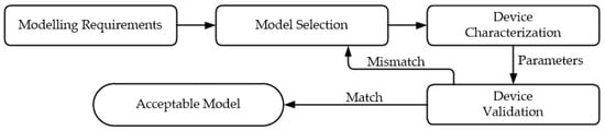 For device models, the electrical variables and their dependencies needs to be captured with precision. The device engineers consider accuracy and simulation time as crucial factors. A simple device model generally provides fast simulation speed but compromises on the physics-based aspects of device behaviour and simulation accuracy. Thus, for determining the operation of a device, a physics-based analytical model is usually used for simulation, but it is very complex to understand. In addition, it is tediously long and is not practical for circuit design. Thus, the choice of a model is dependent on the practical application for which it is intended. Based on these factors, a basic device modelling procedure can be generalised, as shown in the block diagram of Figure 1.