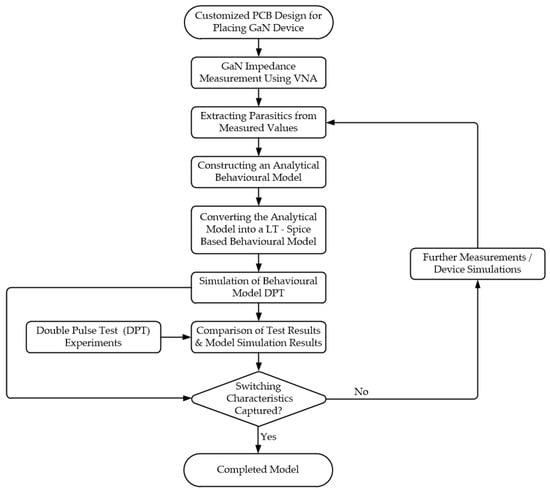 For power semiconductor device models, the intended use is typically as a power switch in power electronics applications. Usually for power devices, Double-Pulse test (DPT) circuit is used to validate the switching behaviour of the device model. Additionally, it is sometimes used for device characterisation if the dynamic performance is of interest for the investigation. Based on the experimental validation results, the proposed model may be either selected or rejected. If the device model cannot be accepted, a new device model needs to be designed repeating the above process. In this paper, the process designed for GaN HEMT modelling is as elaborated in Figure 2.