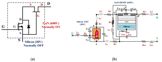 The parasitics of the enhancement mode GaN HEMTs/GITs structure are as shown in Figure 3. As shown in Figure 4, the cascode device has an additional set of parasitic elements due to the low voltage Si device.