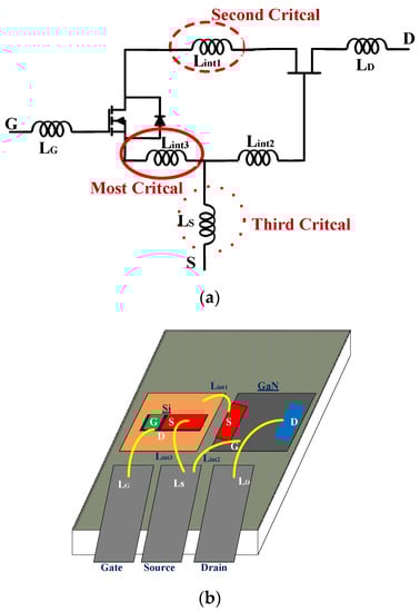 According to Huang Cascode device model, the most critical internal inductances are as shown in Figure 5a. Figure 5b shows the layout of the GaN HEMT cascode inside a conventional TO package. The arrangement of the device shows that parasitic inductances are primarily caused due to the interconnection between the device die, the leads and other interconnections. As the device currents with rapid transitions are restricted to such a compact area, the coupling effects between different conductors become significant and cause deviation from the expected behaviour. In this paper, we use this Cascode model which has been highly regarded by the power electronics community. According to this model, Lint3 is the current source inductance (CSI) for both Si MOSFET and GaN HEMT, as shown in Figure 5a. Thus, it is the most critical parasitic inductance. Lint1 is estimated to be the second most critical inductance. This is because it is the CSI of the high-voltage GaN HEMT which contributes to the majority of switching loss when compared to Si. Ls is found to be the third most critical inductance.