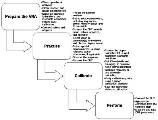 This work is based on the full two-port calibration procedure described in [34]. The “short”, “open” and “load” steps were carried out using the calibration apparatus. Custom adapter PCB was used to implement “through” calibration step via extending the calibration plane. The PCB used for mounting the device is as shown in Figure 9, and the test setup used to apply these characterisation procedures is shown in Figure 10.