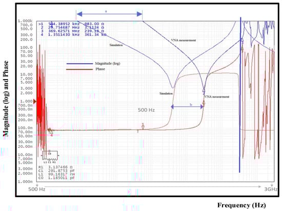 In Figure 11, there is a considerable difference (lengths a and b) between the simulation and VNA measurement response. This can be attributed to the fact that the actual device parasitics are not only composed of a series RLC structure. It is due to a parallel combination of other elements such as the capacitor, as shown in the above figures.