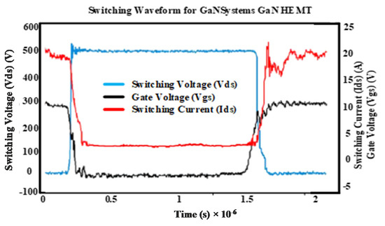 For the GaN systems device, the switching voltages of the proposed model are in good agreement with the experimental results, as seen in Figure 17. This is specifically true for the transient and oscillations during turn OFF instants. In addition, towards turn OFF, it follows the experimental voltage waveform very closely.