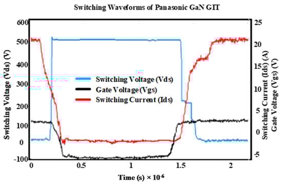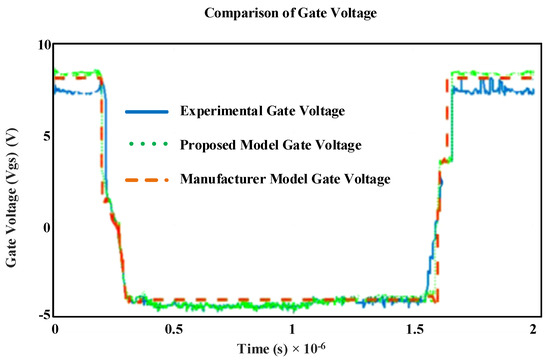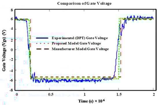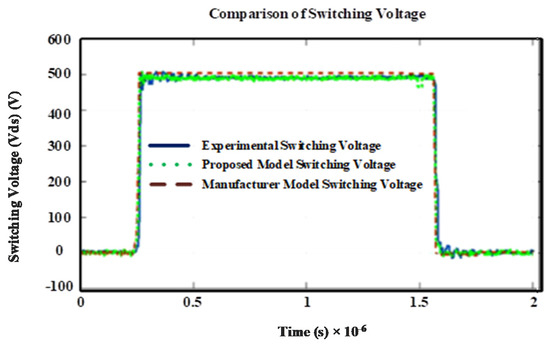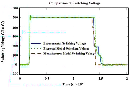 For the Panasonic device, the switching voltages of the experimental model were in steps during turn ON due to the influence of the switching current deviation and noise. As shown in Figure 20, the proposed model was in good agreement with the experimental results, especially during turn OFF and turn ON instants. In addition, towards turn OFF, it follows the experimental voltage waveform very closely.