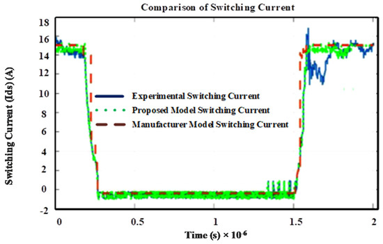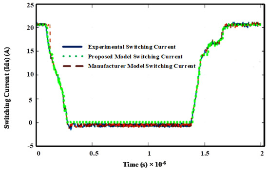 The switching current shown in Figure 22 is in close agreement and there was no significant deviation from the experimental results. Furthermore, the behaviour of the proposed model is similar to the experimental waveforms; however, during turn ON and turn OFF instants it is deviating from ideal.