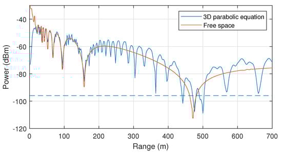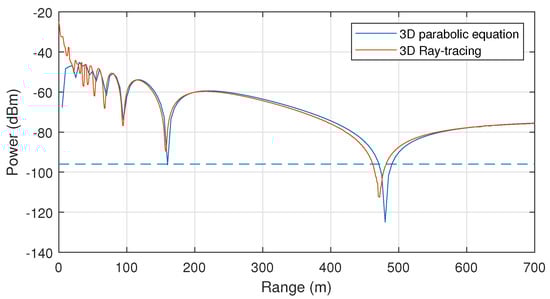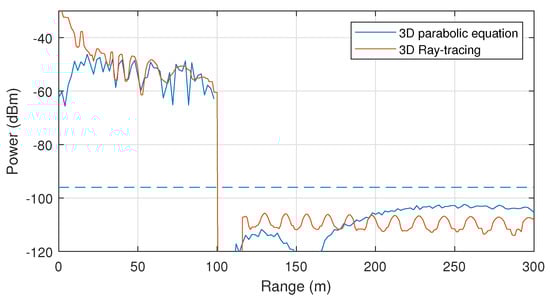 First, we consider the simplest case of propagation over a smooth, PEC surface without obstacles. Figure 1 demonstrates the distribution of the signal level on the height of 1.5 above the ground. This height is selected based on the average car height and, accordingly, the height of the receiving antenna. The alternation of interference minima and maxima is clearly observable. In particular, the influence of interference can lead to a decrease in the level below the threshold value −96 dBm. It is also clearly seen that the PE and RT methods yield almost indistinguishable results.
