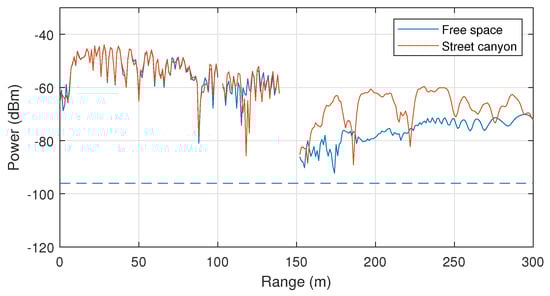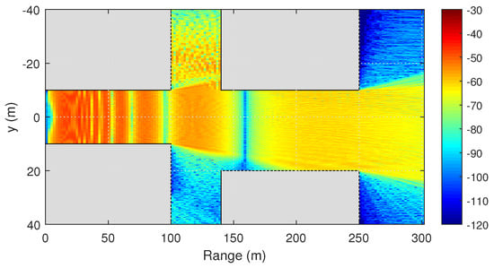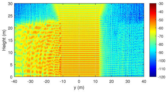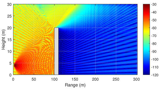 One can clearly see from Figure 5, that the field behind the building is significantly lower than the threshold −96 dBm. The loss behind the obstacle is about 50 dBm. It can be concluded that it is almost impossible for the radio waves to overcome buildings from above within the considered frequency and power of the transmitter. Thus, if the height of buildings is not known during modeling, it can be considered infinite without much loss of accuracy.
