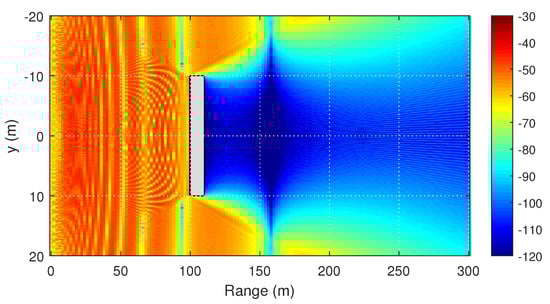 Diffraction on a cuboid. Two-dimensional distribution of the signal level (dBm) calculated by the two-way PE method.