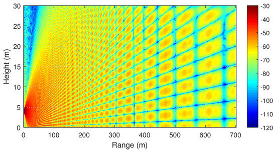 This section presents the results of numerical modeling for various propagation conditions. In all further examples, the antenna is located at a height of 4 m at the point . The antenna is omnidirectional in the horizontal plane and has a Gaussian radiation pattern [] with beam width 15 in the vertical plane. The radiation frequency is equal to 5900 MHz. The polarization is vertical. For the assessment of the proposed method accurately, the implementation of the ray-tracing method from FEKO WinProp software package is used. The Matlab code of the proposed method is located in [].