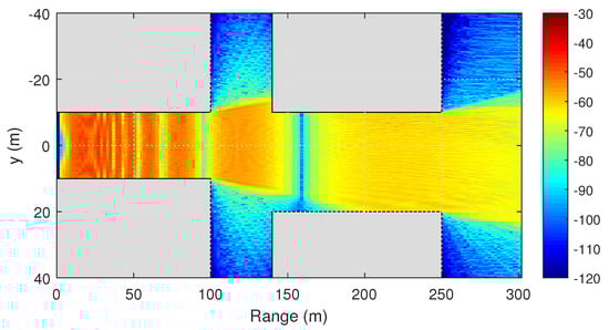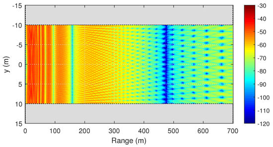 Propagation in a street canyon. Two-dimensional distribution of the signal level (dBm) along the x axis, calculated by the PE method.